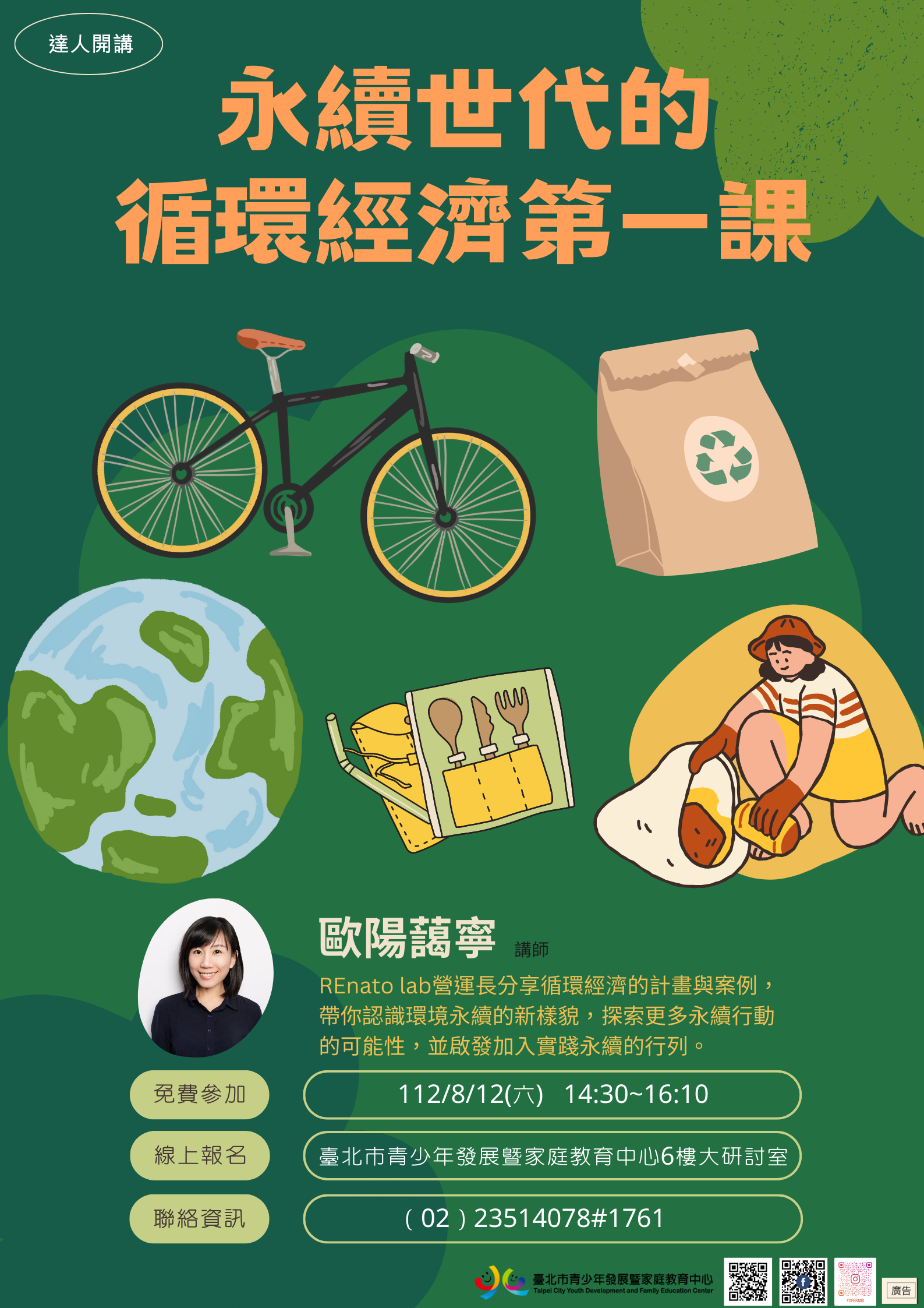 臺北市青少年發展暨家庭教育中心舉辦達人開講「永續世代的循環經濟第一課」,REnato lab營運長歐陽藹寧老師與您分享她踏上致力於實踐永續 的心路歷程,以及過程中的體驗。