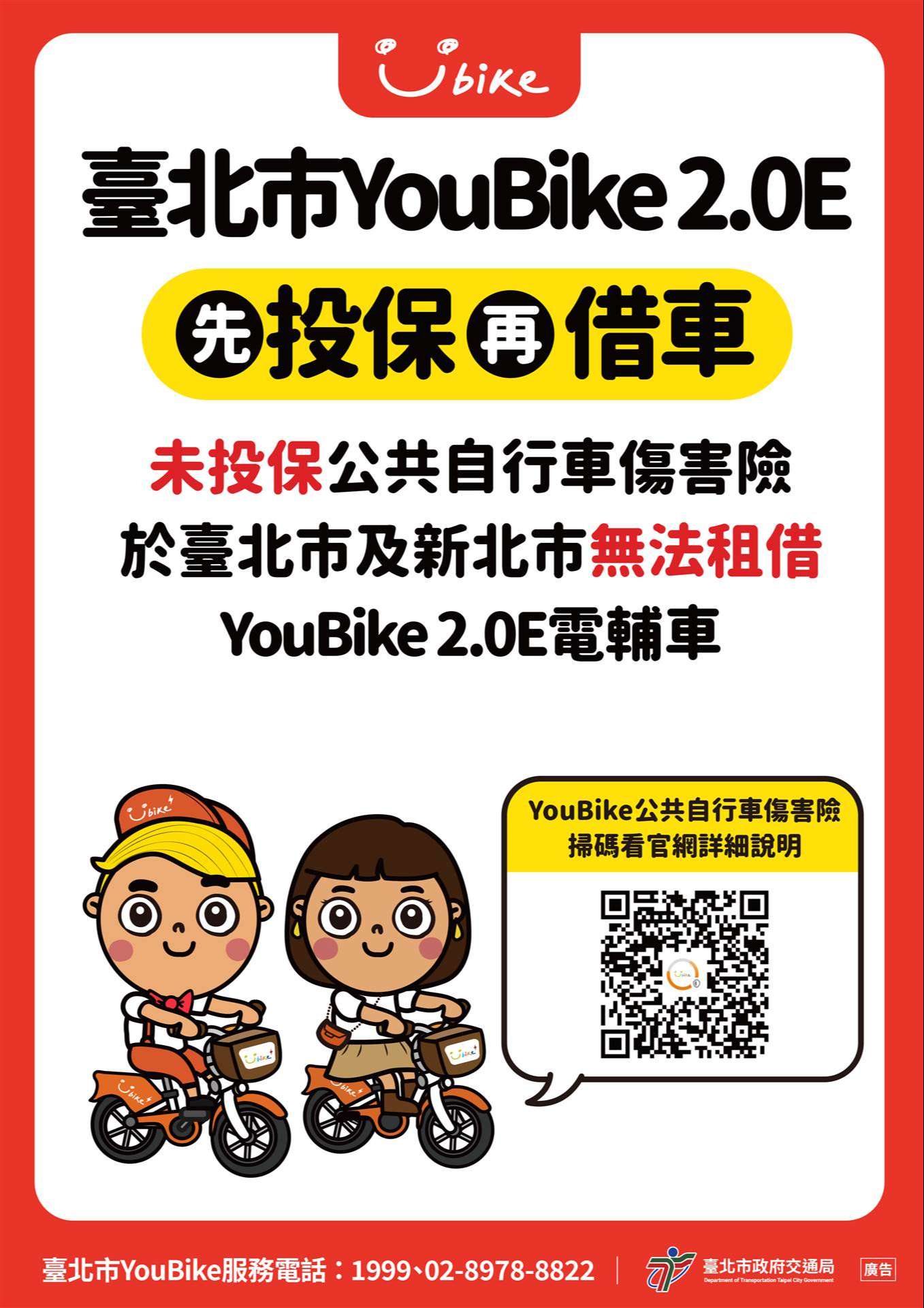 二、查本市規劃於近期陸續引進公共電動輔助自行車YouBike 2.0E,考量其加速快、騎乘距離長等特性,YouBike使用者 須先投保公共自行車傷害險方能租借YouBike2.0E,以提升 其騎乘時之保障。為周知學生族群上揭規定,本府交通局 製作「臺北市YouBike2.0E先投保再借車」EDM,請貴校納 入9月交通安全月向學生加強宣導,並協助運用各類影音媒 體露出(如:APP、LCD、智慧面板及電視牆等介面)、官 網及社群平臺(如:Facebook、Instagram、 YouTube、 Line及Threads等平臺)等多元管道露出該資訊。
