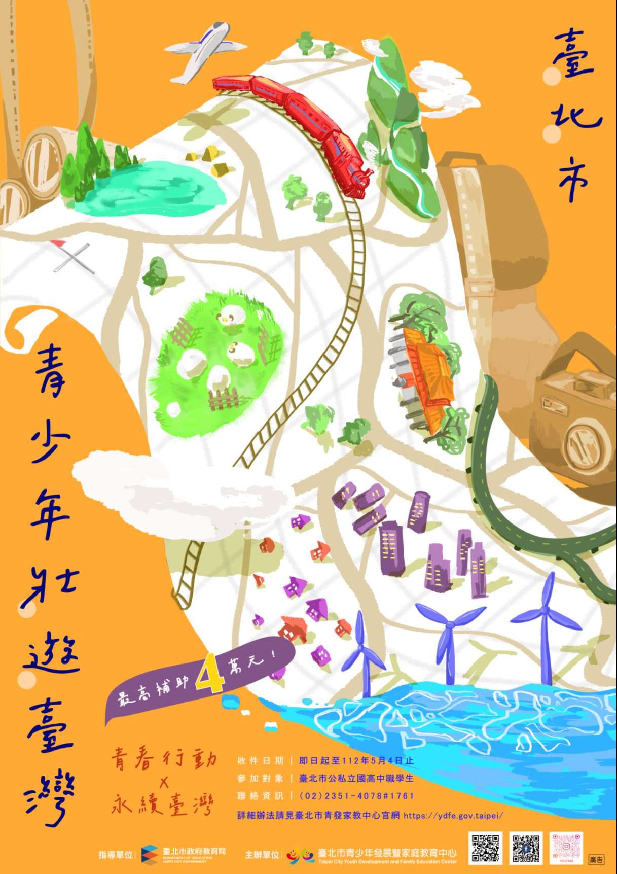二、計畫相關資訊如下: (一)補助對象: 1、臺北市公私立國高中(職)學校學生(含臺北市教育 局立案之實驗教育個人、團體、機構)。 2、設籍臺北市之13至18歲青少年。 (二)申請期間:即日起至112年5月4日止。 (三)補助金額:上限為新臺幣4萬元整。 (四)徵件內容:由青少年自行規劃壯遊行程,主題需與聯合 國永續發展目標(SDGs)相關。