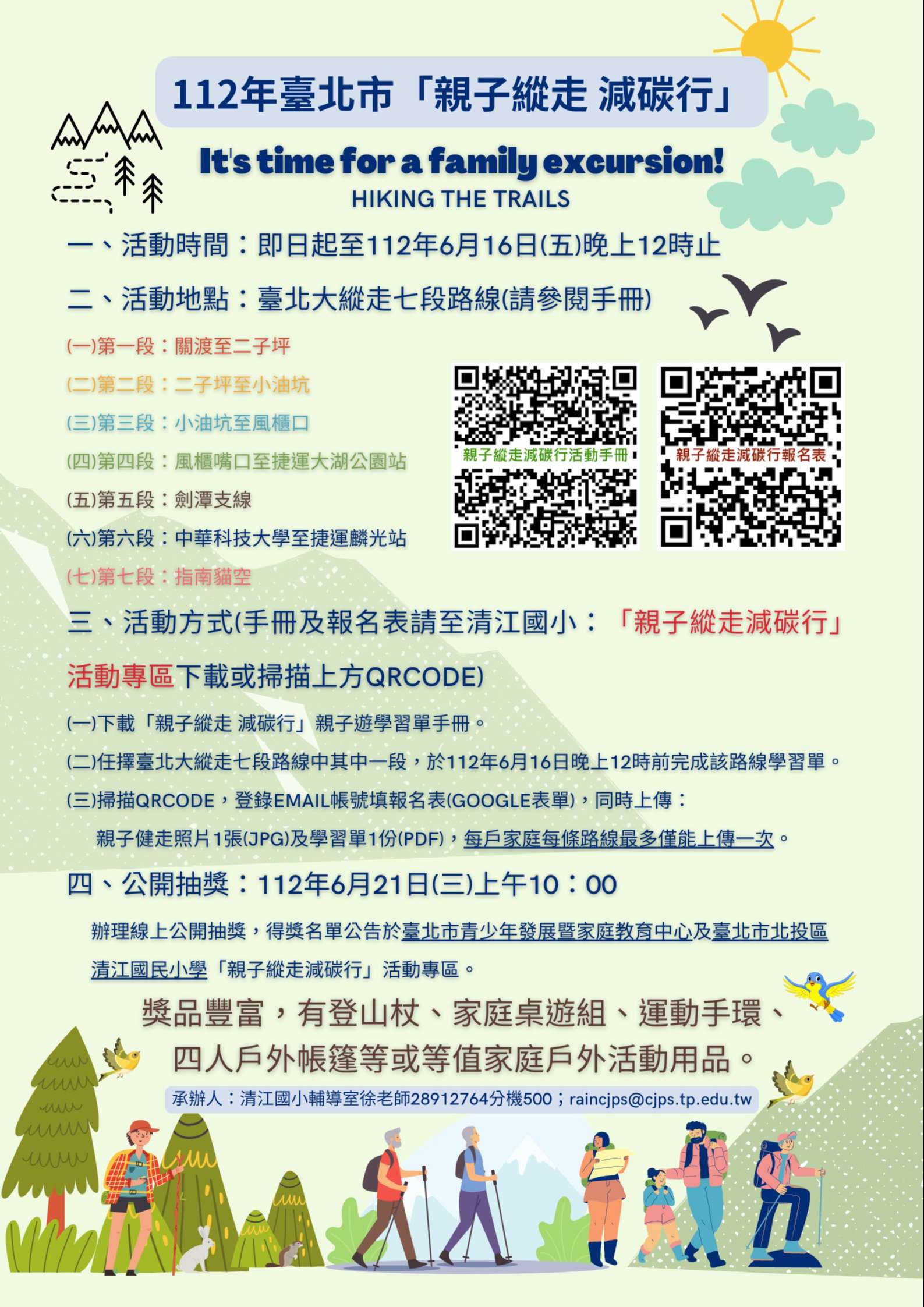 二、活動時間:即日起至112年6月16日晚上12時止。 三、活動地點:臺北大縱走七段路線(詳如附件) (一)第一段:關渡至二子坪 (二)第二段:二子坪至小油坑 (三)第三段:小油坑至風櫃嘴口 (四)第四段:風櫃嘴口至捷運大湖公園站 (五)第五段:劍潭支線 (六)第六段:中華科技大學至捷運麟光站 (七)第七段:指南貓空 四、活動方式 (一)欲參與活動者請下載1、「親子縱走減碳行」學習單手冊(網址連結: https://drive.google.com/file/d /1OI9CDqUGQ9Vyxra-URWDf4o06cebK4jI/view? usp=share_link)。 2、報名表(網址連結:https://forms.gle /GwjaNf8Y9HdrHgmr6)。 (二)任擇臺北大縱走七段路線中其中一段,於112年6月16日 (星期五)晚上12時前完成該路線學習單,並將基本資 料、親子健走照片1張及學習單1份,拍照上傳至指定網 址即可參加抽獎。 (三)每戶家庭每條路線最多僅能上傳一次。 五、本活動訂於112年6月21日(星期三)上午10時辦理線上公 開抽獎,得獎名單公告於臺北市青少年發展暨家庭教育中 心網站及臺北市北投區清江國民小學「親子縱走減碳行」 活動專區。倘有疑義,請洽臺北市北投區清江國民小學輔 導室徐老師,電話:02-28912764轉500;Email: raincjps@cjps.tp.edu.tw。
