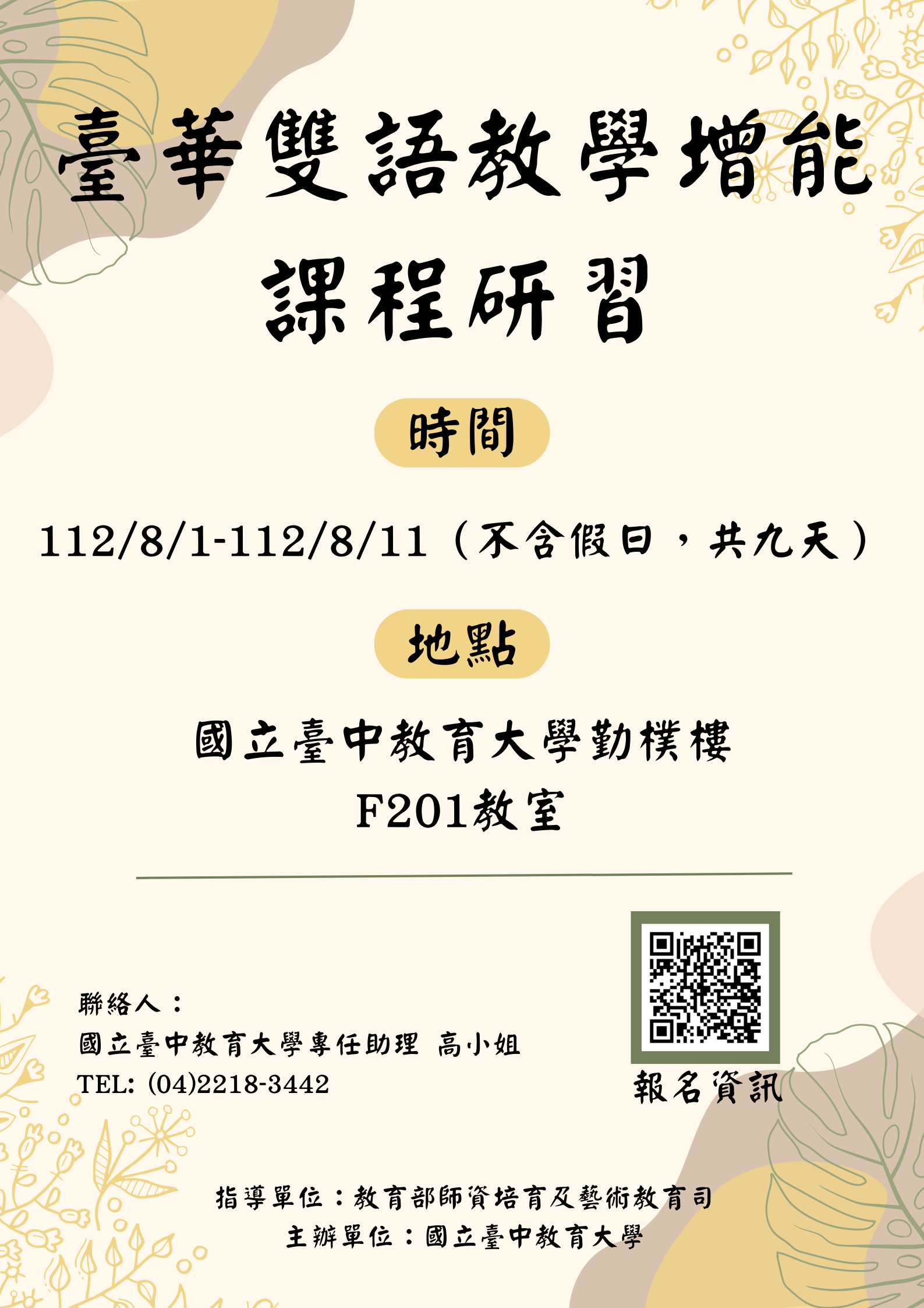 三、研習對象:國民小學教師,共50名。 四、研習日期及地點:112年8月1日至112年8月11日(不含假 日),國立臺中教育大學勤樸樓F201教室。