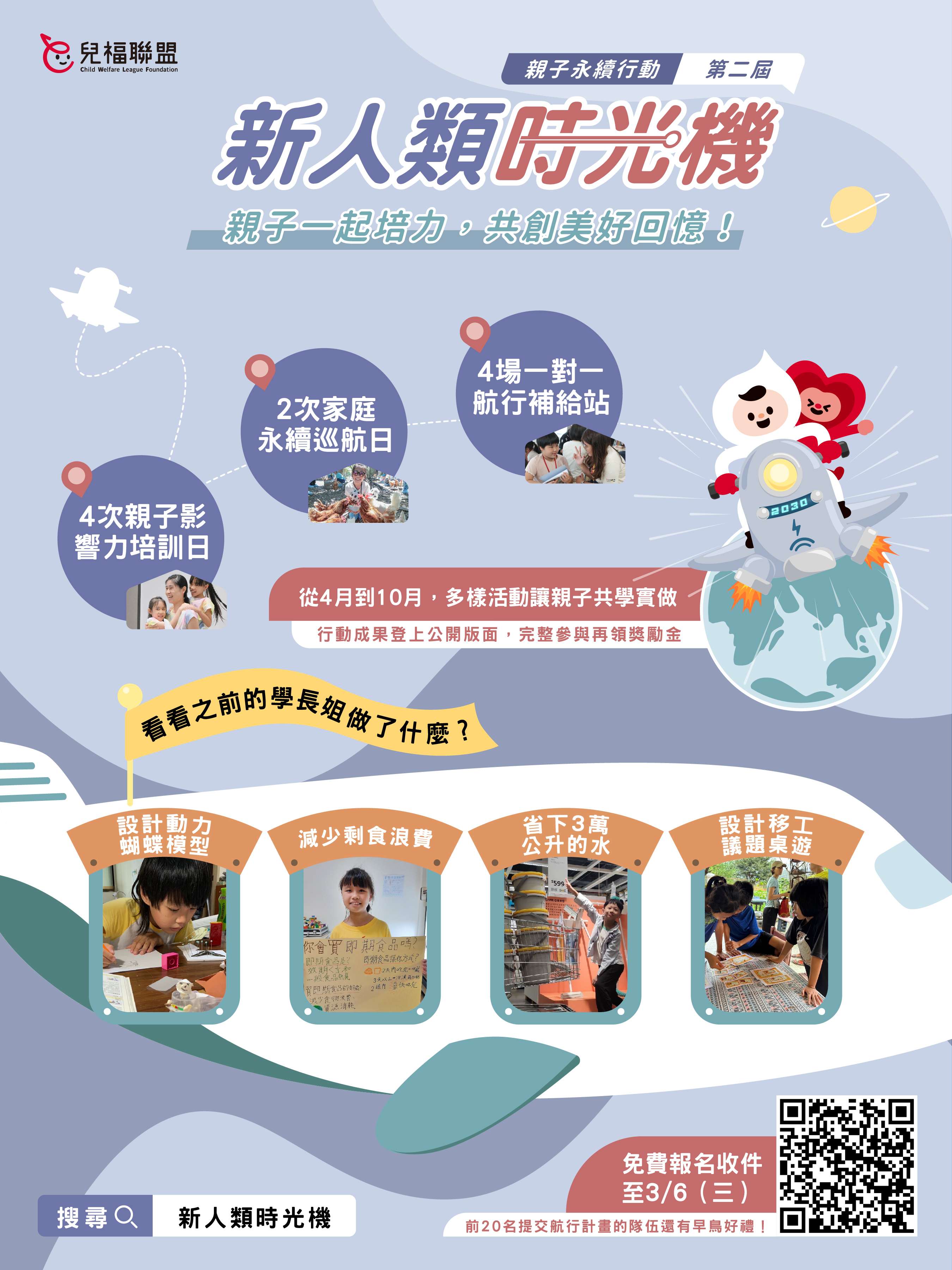 《新人類時光機》是以家庭為單位的永續行動培力計畫, 希望透過親子共學培養孩子的觀察、同理能力,並讓 親子在過程中一同練習關懷世界,接觸更多元的永續發展 (Sustainable Development)議題,建立孩子的國際視野並培養孩子的素養與問題解決能力,預計本屆將選出10至15組隊伍,透過專業師資帶領的設計思考共學工作坊、多元的戶外參訪體驗活動、一對一的永續行動方案指導會議等等,激發孩子系統思考、解決問題以及規劃執行的能力,發想創新永續行動方案,來解決觀察到的問題困境。 參與本次計畫不需要繳交任何費用,但須確保能參與所有計畫的課程內容,計畫期間僅能請假1次,自1月2日(二) 起開放線上填寫報名表申請,截止日期為3月6日(三), 報名申請網站: https://bit.ly/48o7eFe。