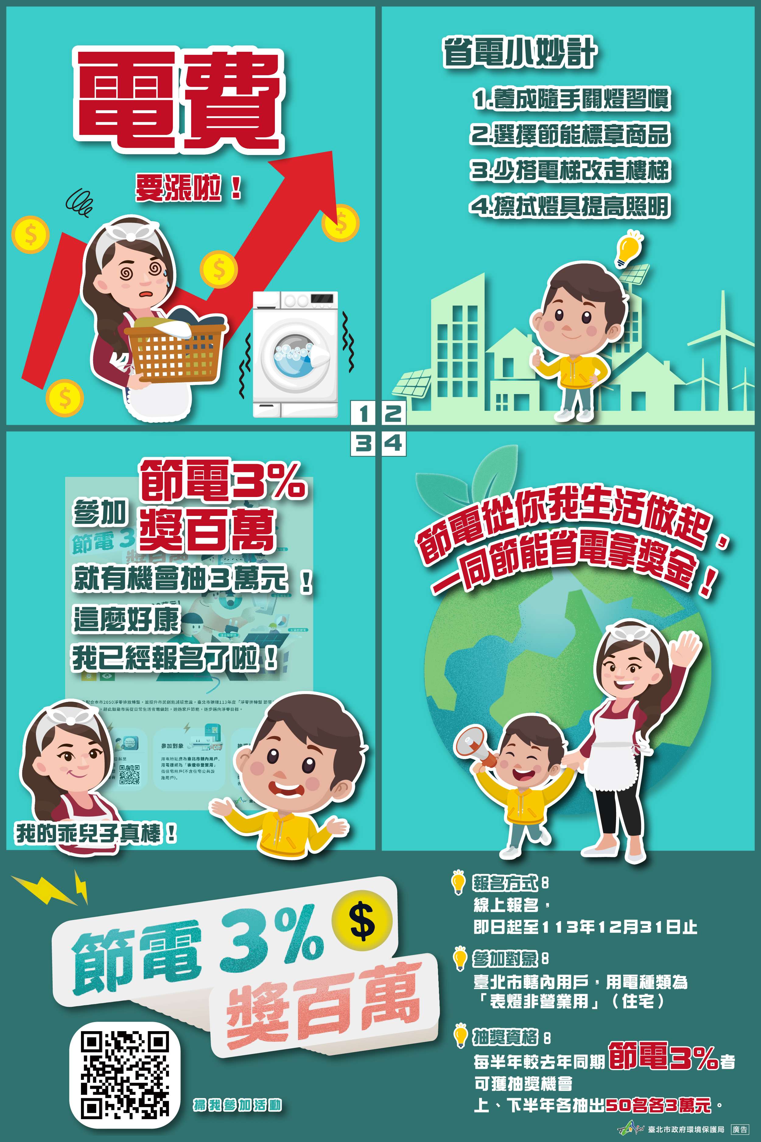 三、為讓活動訊息廣為周知,請貴校透過班級聯絡簿張貼單 張、班群訊息或校內活動等方式推播,俾宣傳登錄電號參 加旨揭活動。 四、該局並已製作活動相關問與答,置於活動網站(網址: https://energysaving.gov.taipei/)頁面刊登「常見問 題」,併請參考。
