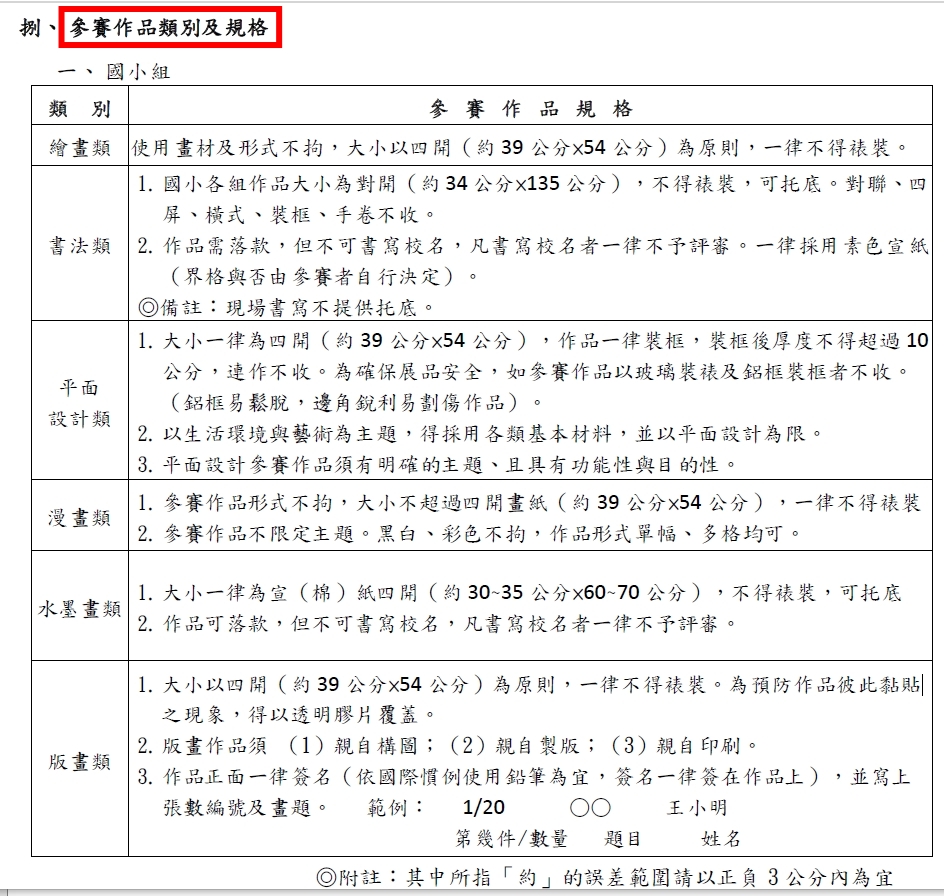 二、參賽作品組別、類別、規格及材質等項目,如有未按個別規定及本實施計畫內所載之任何規定者,該件作品取消得獎資格。