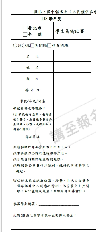 4校內初審選出之作品,學校會【統一】協助線上報名並印製正式報名表、作品卡(貼於作品背面右上左下)並請【參賽學生】、【未滿20歲之參賽者家長或監護人簽章】 及【學校校內指導老師】在作品卡上面親簽。