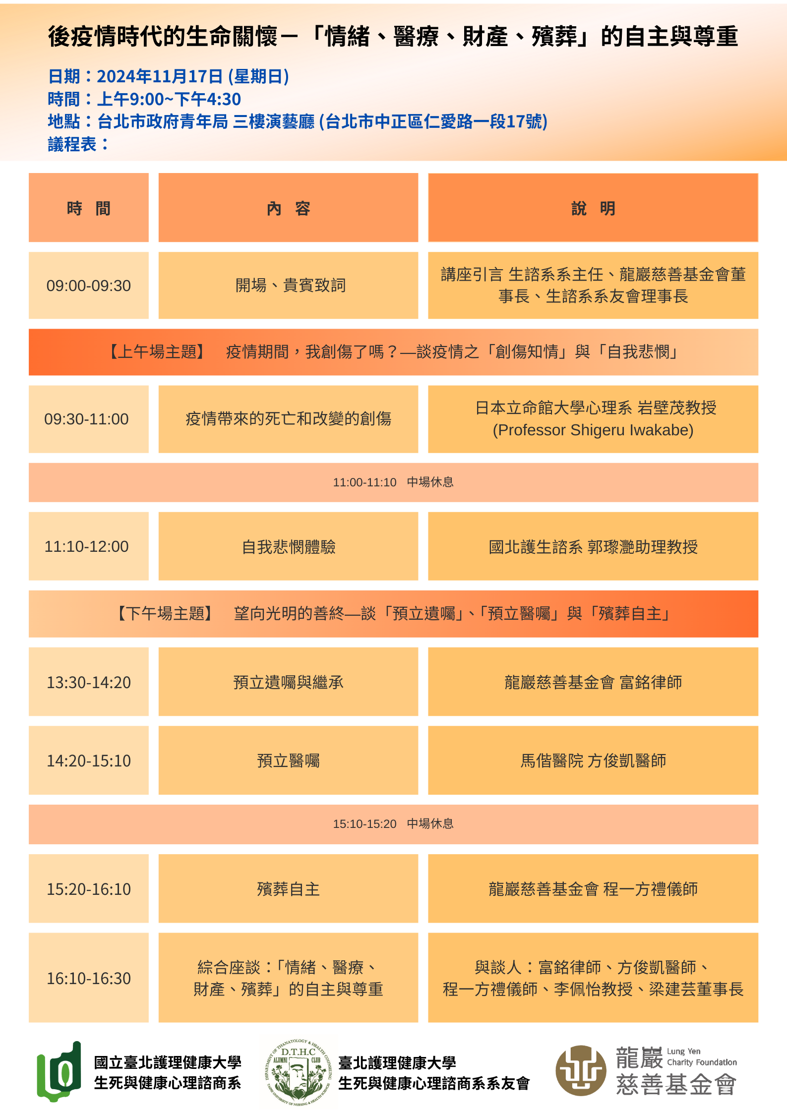 一、講座主題:「後疫情時代的生命關懷—『情緒、醫療、財 產、殯葬』的自主與尊重」。
