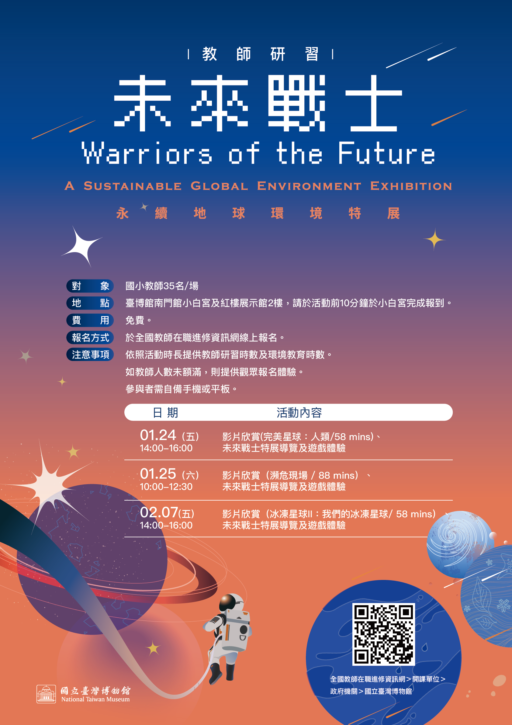 二、本館訂於114年1月24日(星期五)、1月25日(星期六)及2月7 日(星期五)假南門館(臺北市中正區南昌路一段1號)辦理三 梯次教師研習課程,請轉知所屬並鼓勵教師報名參加。參 與研習之教師,將依課程時長核發研習及環境教育時數。