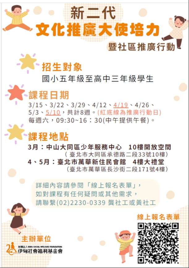 【轉知】財團法人伊甸社會福利基金會114年「新二代文化推廣大使培力暨社區推廣行動」課程資訊,歡迎學生踴躍參與。課程自114年 3月15日至5月10日止每週六上午9時30分至下午4時30分地點及相關資訊詳如附件