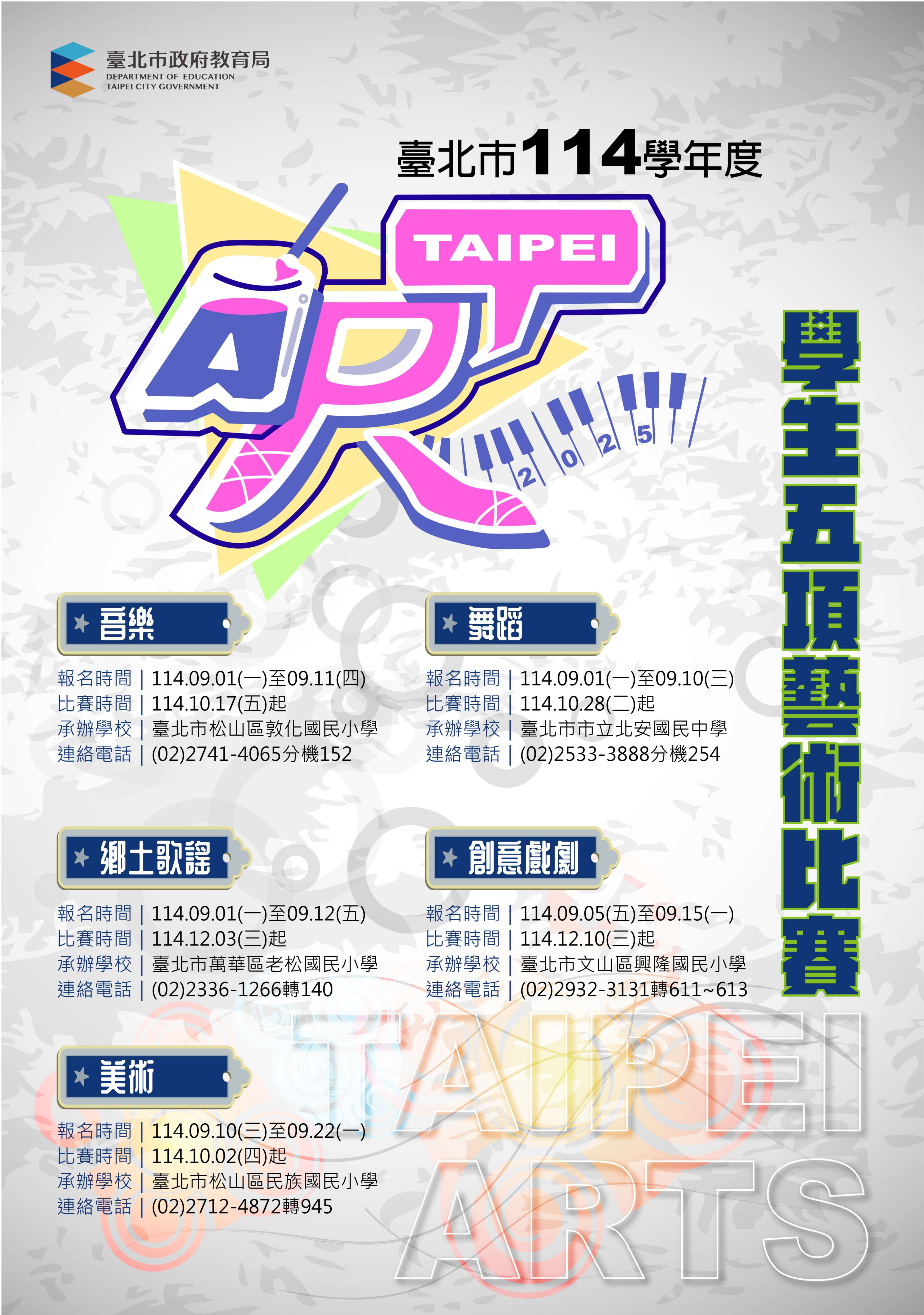 詳細時間資訊請洽附件與五項藝術官網 https://www.tpcityart.tp.edu.tw/Home/SchoolApplyArea