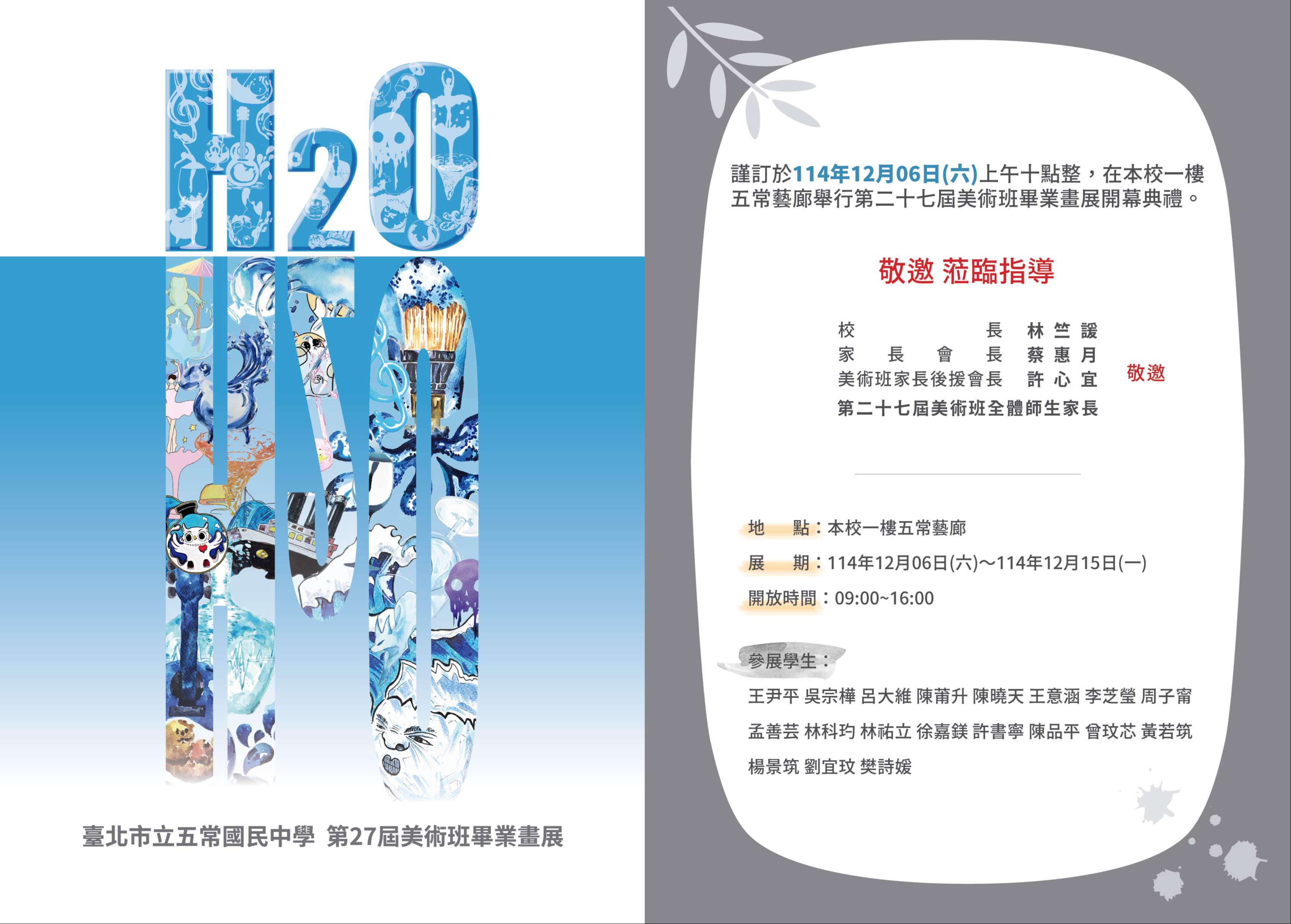 一、五常國中謹訂於114年12月6日(星期六)舉行第27屆美術班 「H2O」畢業畫展活動,開幕典禮為上午10時舉行,歡迎各界貴賓共襄盛舉。