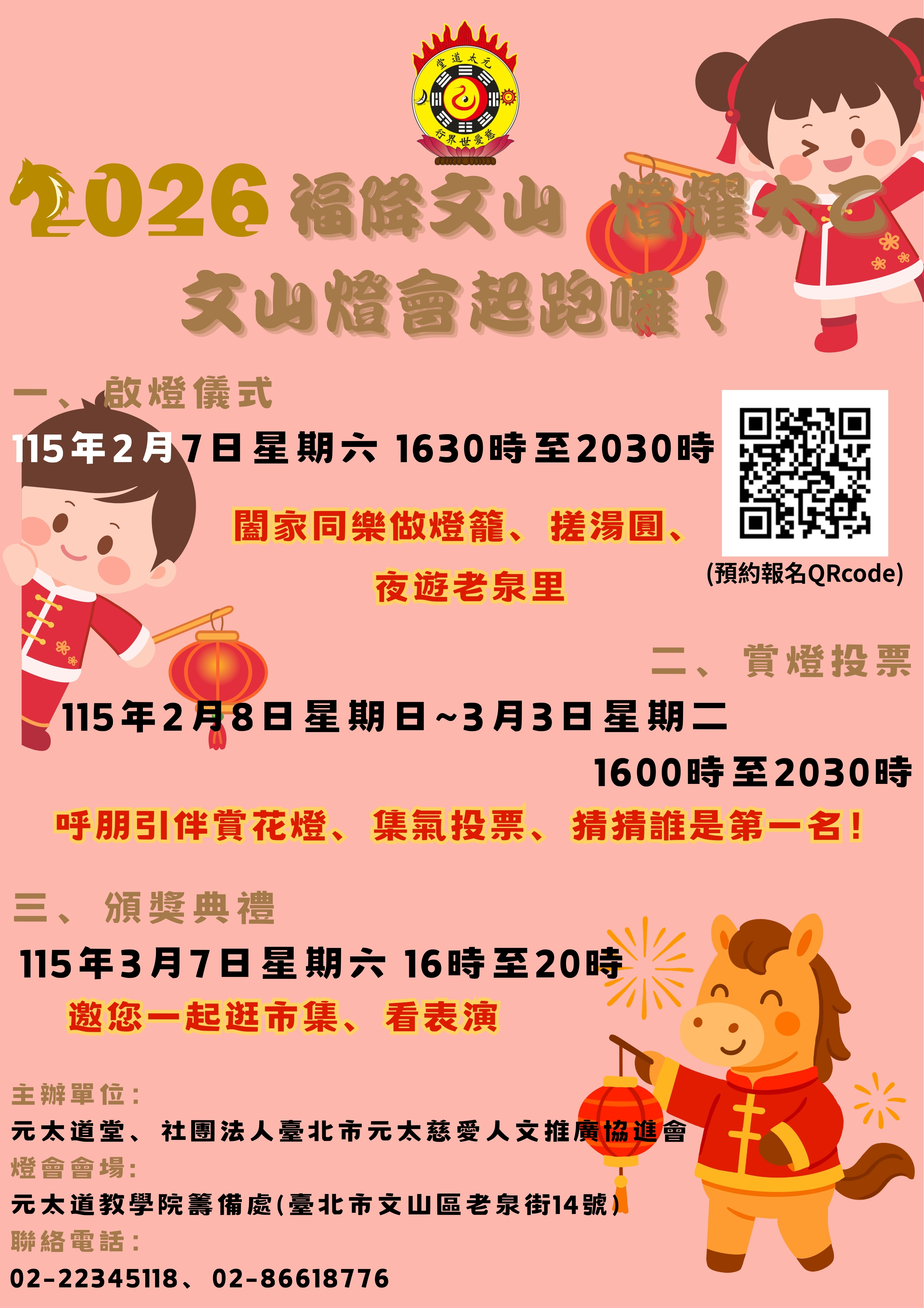 (一)點燈儀式:115年2月7日(六)下午4時至8時30分, 屆時將安排傳統元宵燈節活動:搓湯圓、做火把、做燈籠。