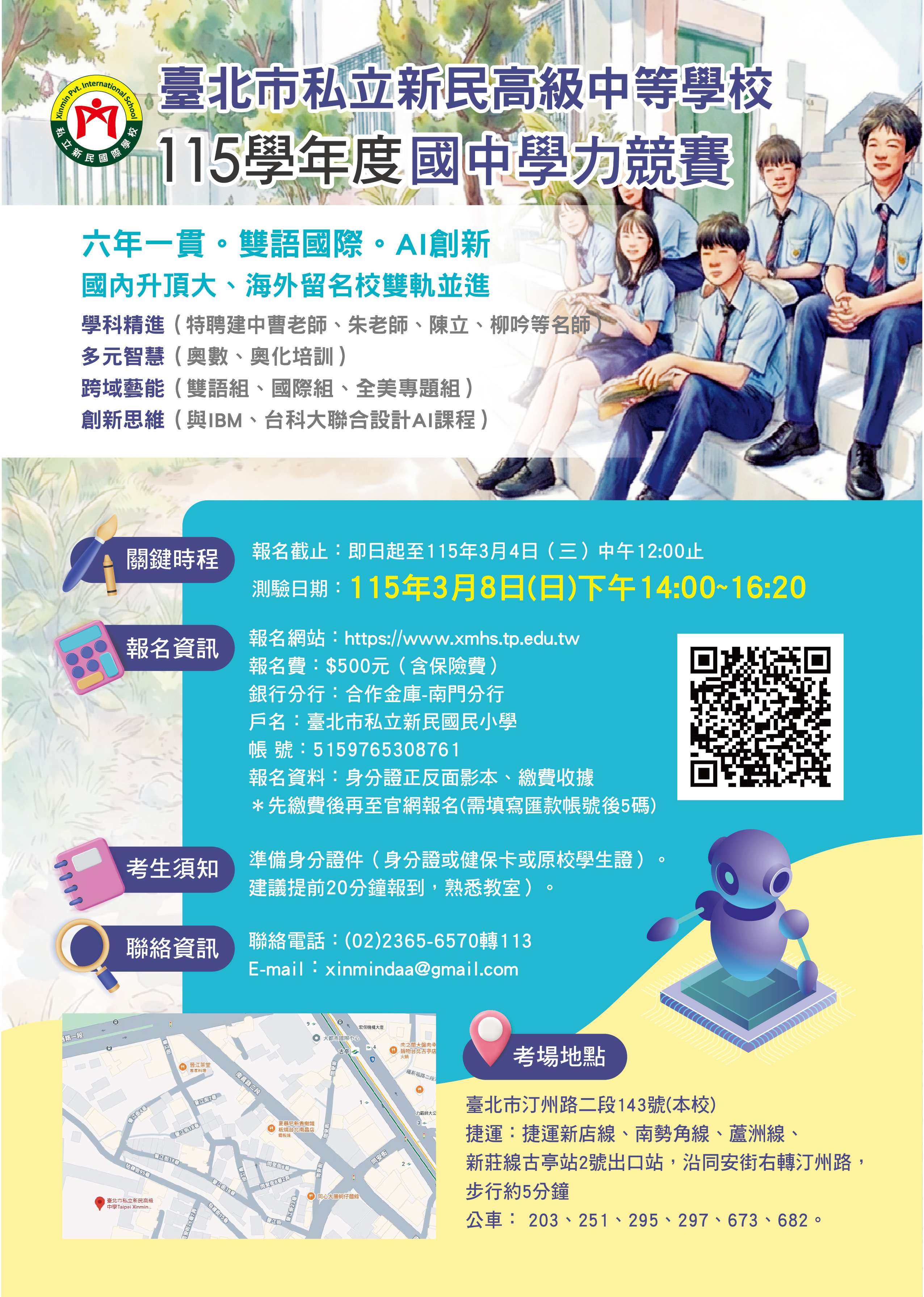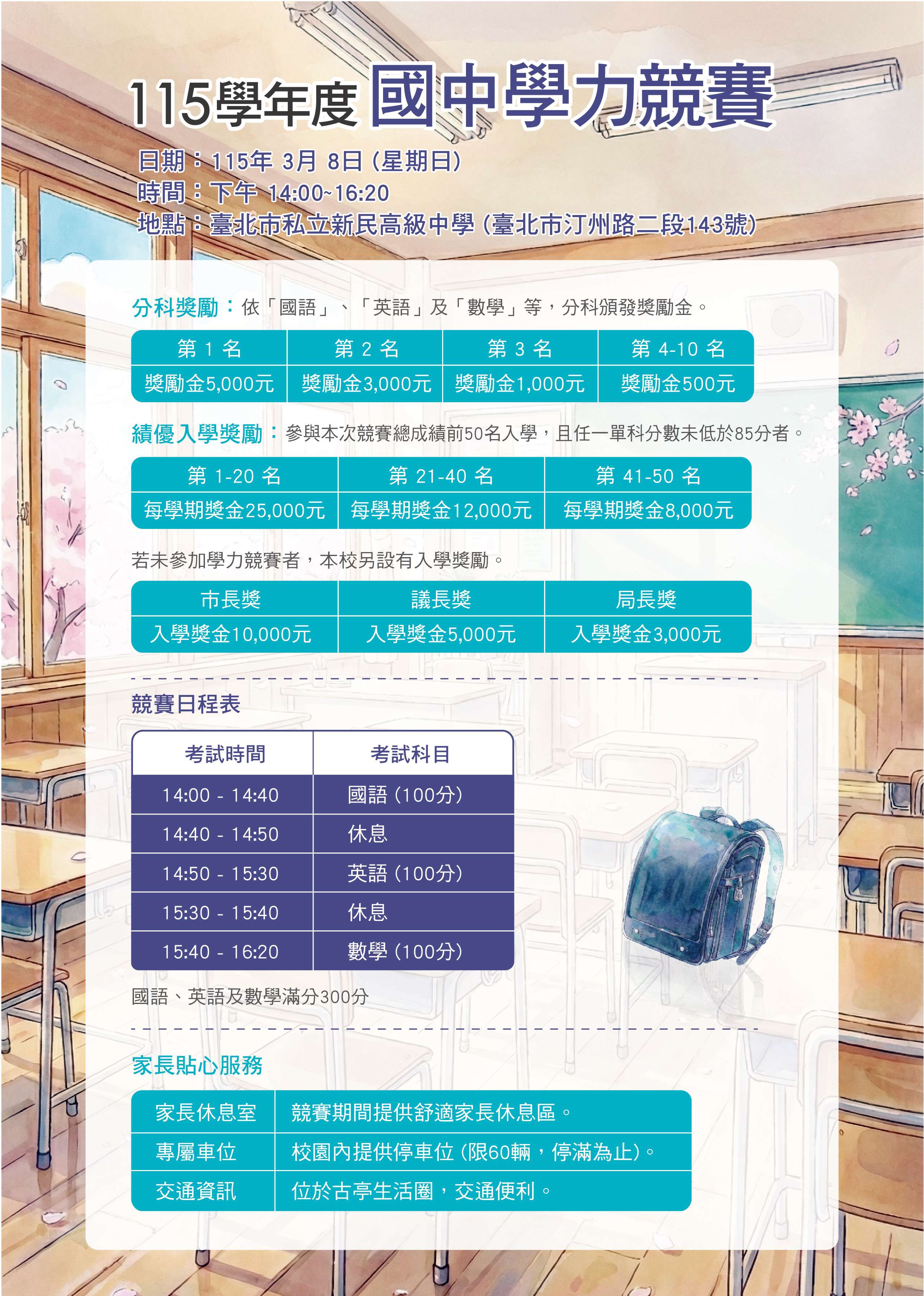 六、當天於臺北市私立新民高級中等學校同步辦理國中入學課程說明會,115年3月8日 (星期日)時間下午14:20~15:20。