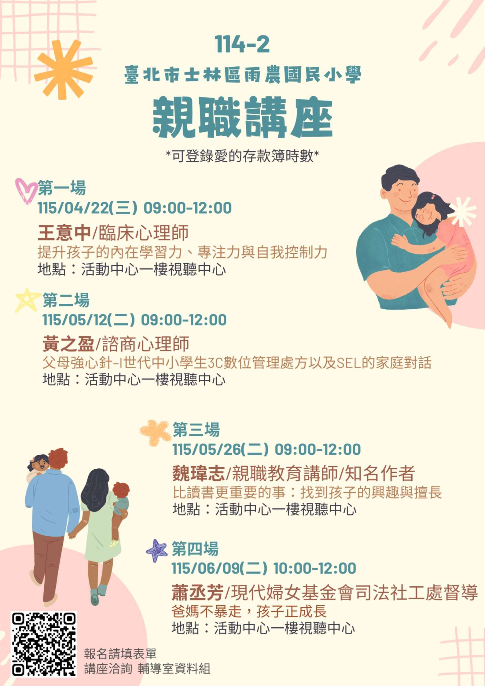 (五)四場講座均核發愛的存款簿時數,活動報名連結: https://forms.gle/WumW89QZbUt8TMzu7